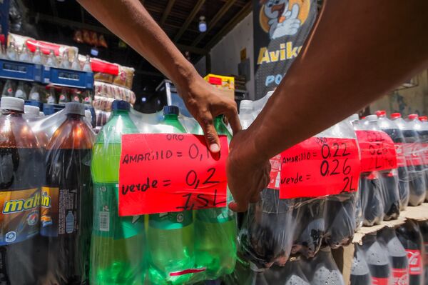 Bottles of soda with prices displayed in grams of gold at a store in Tumeremo.