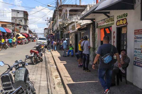 Pedestrians gather near shops, one of which buys gold, in Tumeremo.
