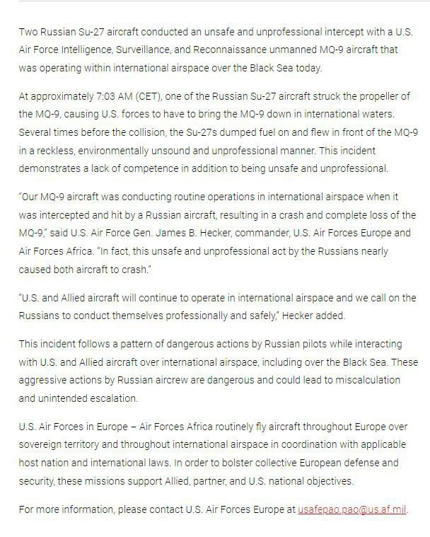 The Russian jet was detected closing in. And a decision to destroy it was made. It was either shot down, or the drone was intentionally piloted into a crash vector. It's hard to believe that a jet would just randomly collide with a drone- mid-air collisions are always very suspicious, unless they're happening at a landing strip or something where a lot of air traffic is forming up, and with less maneuverable aircraft. Think about all of that airspace that the Russian pilot was NOT in, in order to collide with this drone.